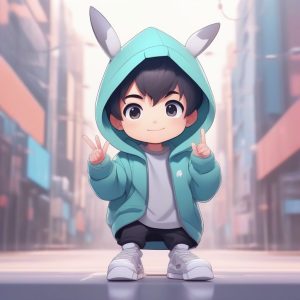 AI art prompt English – Retro 80s Chibi Boy: Pastel Geometric Minimalist Character Card (Dynamic Pose)