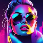 Retro 80s pop anime girl, bright neon colors, VHS texture, dramatic lighting, bold outlines, city night background, playful retro fashion, energetic pose, sparkling eyes
