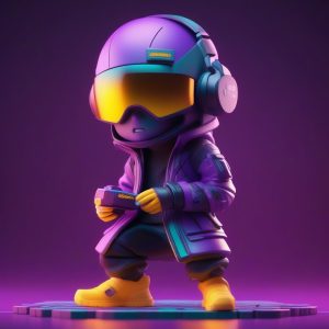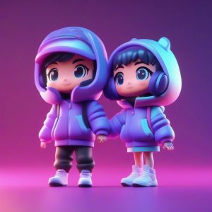 全身站立照片,极简动漫卡哇伊Q版赛博少女,Pop Mart风格,粘土与金属混合材质,3D渲染,C4D,Octane渲染,盲盒美学。一个穿着霓虹色高科技服装的Q版赛博少女,拿着发光的控制器,全身站立,专注且酷炫的表情,高能动态姿势。背景:纯深紫色,干净、简单、完全清空,无图案。光线追踪,软硬光结合布光,高细节,8K。