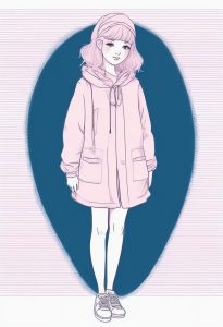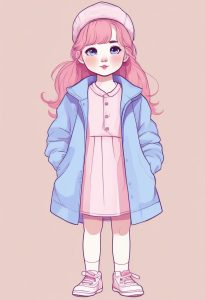 A full body standing smiling girl featuring minimal details and soft rounded lines. Her style is cute doodle and simple doodle, wearing gentle shades of pink lavender and baby blue fashionable attire. The image creates a lighthearted atmosphere, possessing a charming aesthetic, and an innocent playful expression.