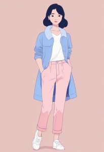 A high-quality vector illustration style full body image depicting a fashionable girl in a minimalist soft-cute outfit. She is smiling and standing full body, rendered in a Simple doodle style. Colors are a pastel color palette of gentle shades of pink lavender and baby blue. The image features soft rounded lines and minimal details. She exhibits an innocent playful expression and a lighthearted, charming aesthetic. Full body, minimal background.