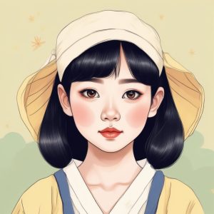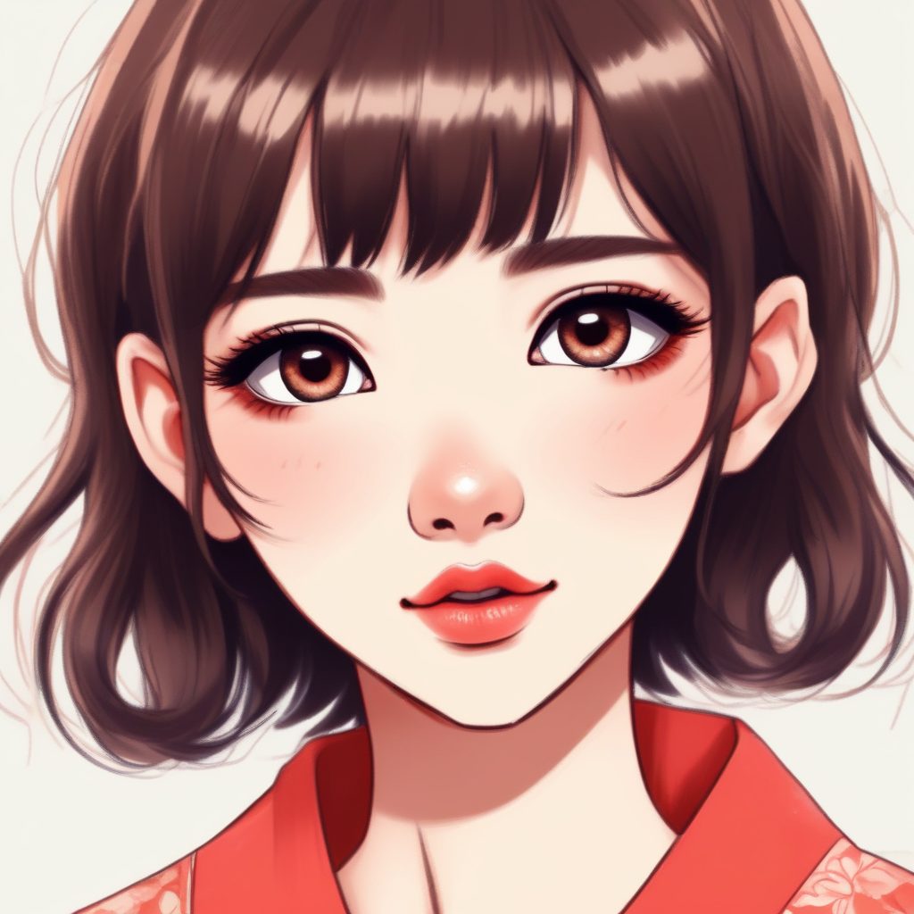 Cute Japanese girl anime portrait, hand drawn illustration style. Focused on beautiful detailed eyes and glossy lips, complemented by heavy rouge and under eye blush makeup. Utilizes warm colors and pastel colors in a crayon style, soft edges, creating a whimsical storybook style. Colored pencil details, featuring textured paper. Solid color background.
