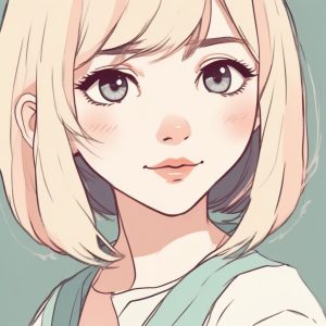 一个可爱的日系少女动漫头像,手绘插画风格。重点描绘美丽的细节眼睛和水润光泽唇,搭配浓郁的腮红和眼下腮红妆容。使用温暖的粉彩色调和蜡笔风格,柔和边缘,呈现出异想天开的童话书风格。彩色铅笔细节,带有纸张纹理。纯色背景。