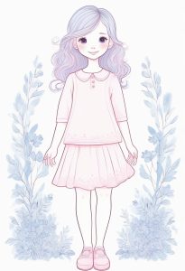 A full body standing simple doodle illustration of a girl in pink-blue fashion. She possesses a charming aesthetic, and the style is lighthearted. There are minimal details to accentuate the soft rounded lines and cute doodle quality. The colors chosen are a pastel color palette of gentle shades of pink lavender and baby blue.