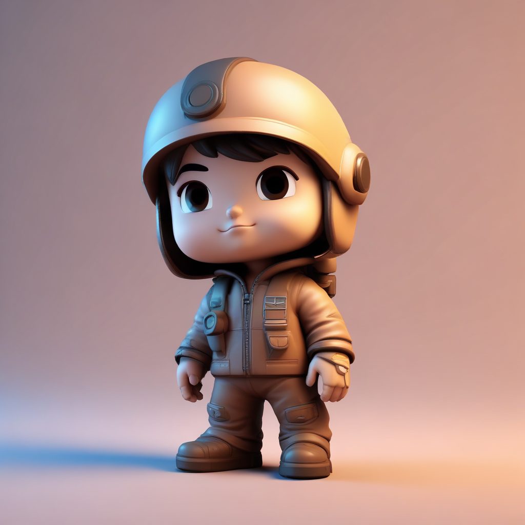 一个Q版地下机械师,全身站立,大头小身,穿着沾有油污的赛博朋克工装。这是一个可爱的盲盒手办,采用光滑的黏土材质,使用柔和的粉彩色调。高细节8K 3D渲染,通过C4D引擎完成,具有精确的光线追踪和柔和的工作室照明。背景是简单的纯棕色,完全空白。