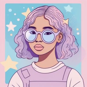 治愈系风格Q版插画提示词,结合粉色、薰衣草和婴儿蓝的柔和色调。描绘一个全身站立的女孩,以夸张的姿态歪头,展现好奇和困惑的表情。