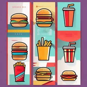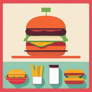 极简波普线条汉堡插画,粗轮廓,黄色、红色、绿色、蓝色的明快扁平色彩,白底,简化几何形状,趣味卡通感,受波普艺术启发,构图活泼愉快。