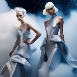 A floating cityscape in the Impossible Couture Editorials style, with skyscrapers resembling glimmering crystal couture gowns, suspended bridges of woven silk, and rivers of liquid gold. Dusk sky, radiant pastel hues, highly stylized geometric abstraction, extravagant textures, futuristic editorial elegance.