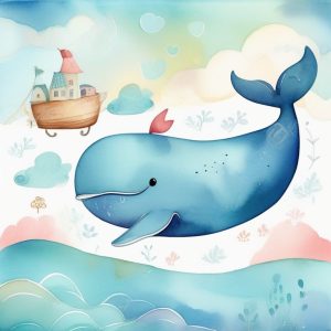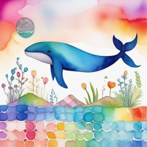 AI art prompt English:rainbow watercolor painting of a flying whale swimming through a sky full of dreamy stars, vibrant splashes, abstract doodle style, journaling page, childlike fantasy
