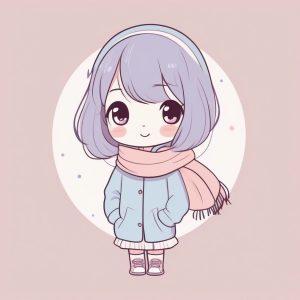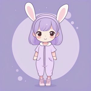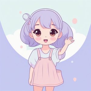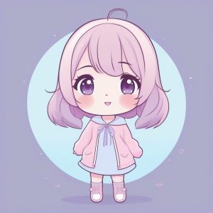 一个可爱的动漫Q版女孩,全身站立姿势。极简涂鸦风格,可爱涂鸦,柔和的粉彩色调,轻微的铅笔草稿风格轮廓,柔和圆润的线条,最少的细节,温柔的粉色、薰衣草色和淡蓝色阴影,天真俏皮的表情,轻松愉快,迷人的美学。纯色背景。