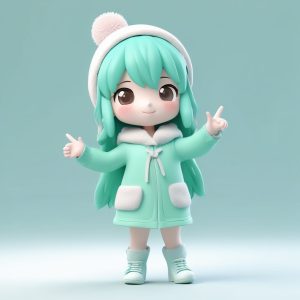 一个可爱时尚的Q版动漫人物,全身站立,穿着草莓牛奶粉色调的冬装和可爱的毛线帽。她正在用手轻轻地触摸她的帽子,表情带着一个甜美的微笑。采用盲盒美学,以圆润的特征和光滑的黏土材质为重点。通过C4D和Octane渲染实现的高细节3D渲染。场景使用精确的光线追踪和柔和工作室照明,展示柔和的粉彩色调。背景是纯浅粉色,8K高细节。
