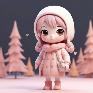 A cute fashionable chibi anime character, full body standing, dressed in a strawberry milk pink-toned winter outfit and a cute knitted hat. She is gently touching her hat with her hand, with a sweet smiling expression. Embodying the blind box aesthetic, focusing on rounded features and smooth clay material. High detail 3D render achieved using C4D and Octane. Precise Ray tracing and soft studio lighting showcase the soft pastel colors. Background is a clean, solid light-pink color. 8K high detail.