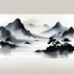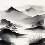 Whispers of tranquility Japanese sumi-e ink landscape, delicate mountains and a distant small house, light gray and black ink washes, foggy fading background, large empty spaces, calm and meditative mood, graceful brushwork.