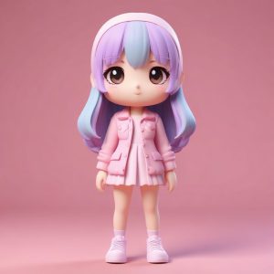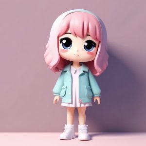一个可爱的Q版女孩,全身站立,穿着oversized的Y2K科技风服饰,强调精致的缝线细节,手中拿着一个微小的发光手机。这是一个高度详细的3D渲染,利用C4D和Octane渲染引擎实现,完美体现了盲盒美学和卡哇伊的魅力。她拥有光滑且完美的黏土材质纹理和圆润的特征。采用柔和的工作室照明和光线追踪技术进行深层全局照明。色彩采用柔和的马卡龙配色,高细节,8K分辨率。背景:纯霓虹粉色,简洁,完全空白,没有图案。