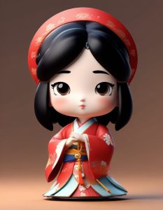 一个可爱的Q版汉服小女孩,圆脸大头,表情温柔且礼貌。她双手端着一杯茶,微微行礼。强调盲盒手办的黏土质感和chibi比例。这是一个专业的3D渲染图像,由C4D和Octane渲染,利用光线追踪在简单的米白色工作室背景下突出其典雅气质。