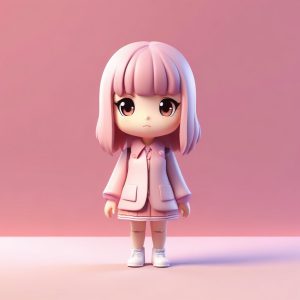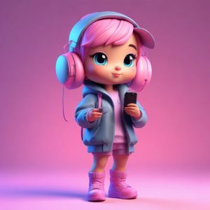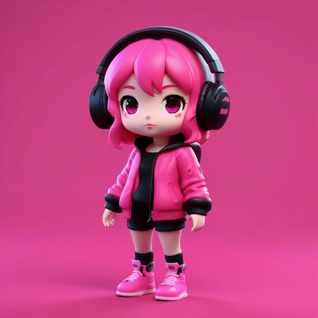 一个全身站立的可爱E-girl电竞少女Q版形象。拥有巨大的头部和娇小的身体,佩戴着超大号的霓虹粉色耳机和黑色潮流服装。采用盲盒手办美学风格。高细节的黏土材质质感,圆润光滑的特征。使用Octane渲染、C4D和3D渲染技术,结合光线追踪和柔和的工作室照明,呈现出充满活力的柔和色彩(霓虹粉和黑)。背景:纯热粉色,干净、简单、完全空白。8K高分辨率。