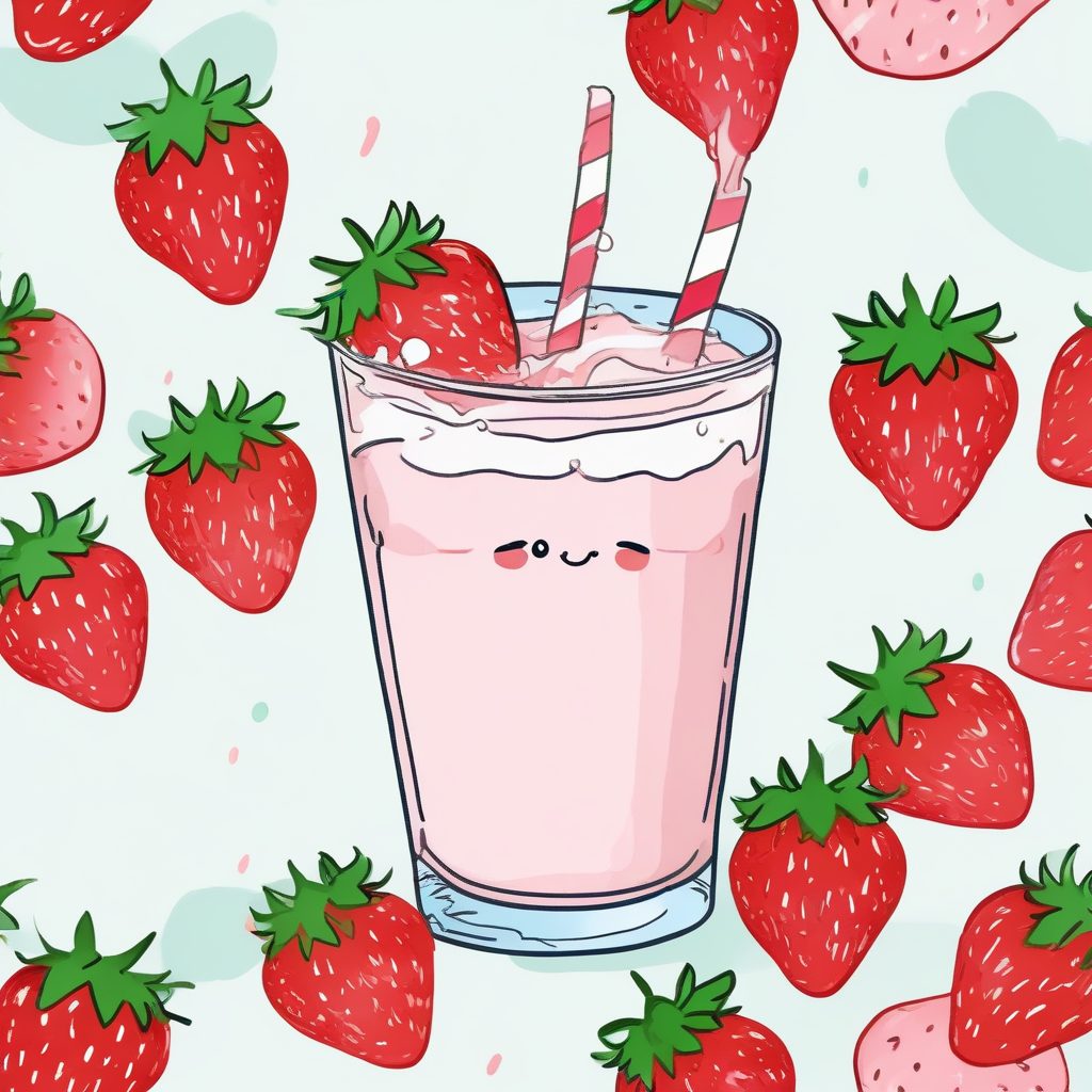 A cute, whimsical hand drawn illustration featuring a strawberry milk theme. It depicts a huge, anthropomorphic strawberry with a sweet expression beside splashing milk. The style is a mix of crayon style and colored pencil strokes, with bright pastel colors and soft edges. The artwork displays obvious paper texture, embodying a vibrant, storybook style of healing illustration.