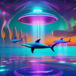 霓虹时尚风格数字绘画中的彩色水母特写,半透明的触须亮着明亮的橙色、绿色和蓝色霓虹光,中央身体发出炫目的紫色光芒,水下场景有漂浮的彩虹气泡,水母动态流动感强烈,背景为深海蓝色调,画面鲜明且风格化。