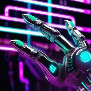 A neon fashion close-up digital painting of a jellyfish, translucent tentacles glowing in bright neon orange, green, and blue, central body emitting a radiant purple light, underwater scene with floating iridescent bubbles, dynamic flow and movement, background in deep navy tones, vibrant, stylized illustration.