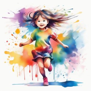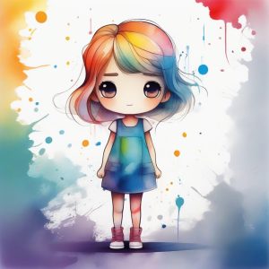 专注于抽象当代水墨风格的Q版女孩全身像。强调自由流动的绯红色和青色水彩、飞溅的墨滴以及动态笔触的随机纹理。生成一张拥有模糊边缘和微妙彩虹光晕的极简艺术图。