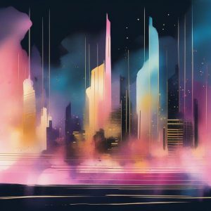 AI绘画提示词中文 – 抽象水墨Q版女孩:绯红与青色的流动水彩插画