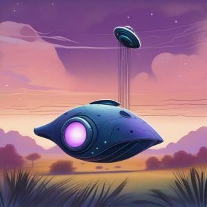 An illustration in retro textured charms style featuring geometric abstract birds soaring above a city at night. The cityscape sparkles with tiny glowing windows and muted violet shadows. The birds are stylized with triangles and circles, mid-flight, their wings reflecting streetlights. The dark background uses faded paint textures and paper grain overlays. The scene exudes enigmatic beauty and classic retro appeal.