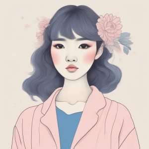 A whimsical illustration of a soft Japanese girl wearing a pink and blue beret. The image utilizes minimalist line art. This hand drawn piece is in a storybook style. Colors are soft warm colors (pastel colors). Coloring employs colored pencil and crayon style techniques, featuring soft edges, subtle paper texture and textured paper grain. Clean, solid color background.
