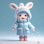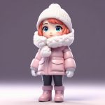 AI生成一张可爱的Q版女孩冬季侧身回眸照。搭配超大围巾和毛线帽,使用C4D渲染营造出温暖的羊毛质感。