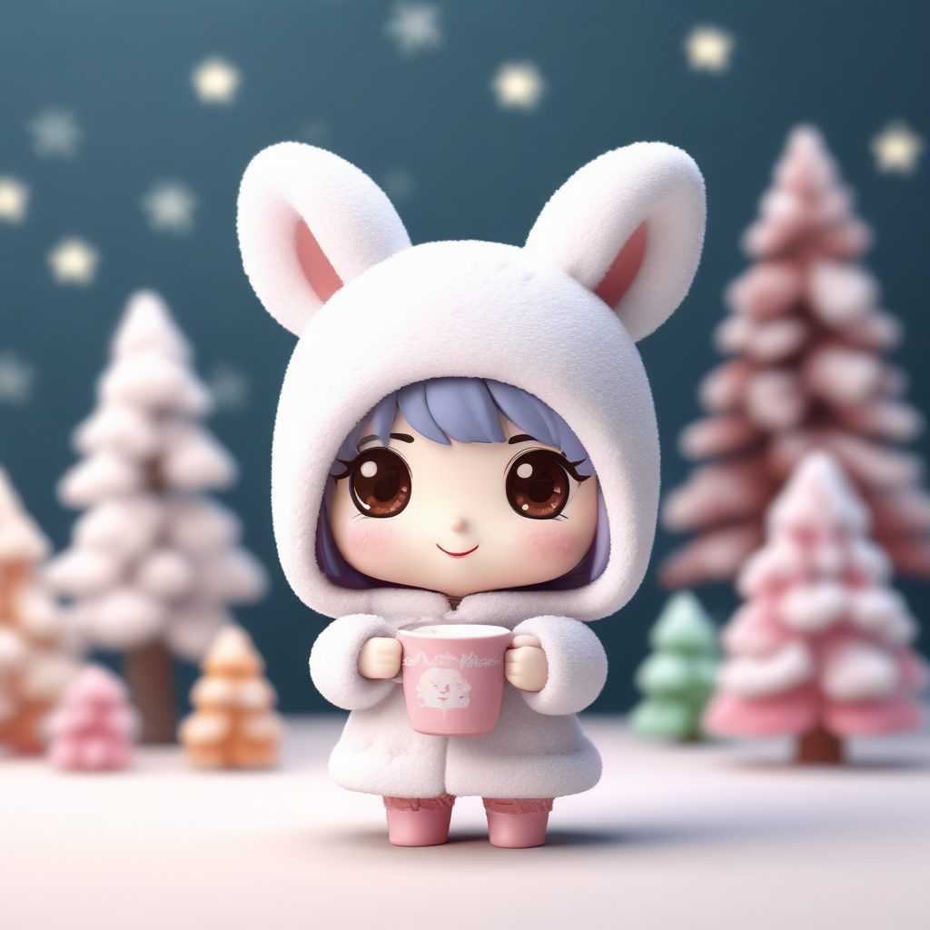 一个全身站立照,展示了一个可爱的卡哇伊Q版女孩角色,拥有大头小身的比例,身穿蓬松的雪兔主题冬日装扮,表情丰富且正在愉快地捧着一杯热可可。角色以极具吸引力的盲盒手办美学设计。材质为迷人的粘土质感,表面光滑圆润。这是一个高细节的3D渲染,通过C4D和Octane渲染引擎实现。场景采用精确的光线追踪和柔和的工作室照明,突显出充满活力的柔和色彩。渲染为8K高细节。背景是干净、简单的纯色,完全空白,没有图案或纹理。
