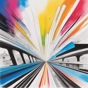 AI art prompt English – Dynamic Urban Fragments: Rainbow Geometry and Architectural Deconstruction