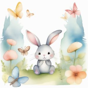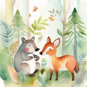 AI art prompt English:Cute children’s storybook style illustration of a smiling blue whale swimming in a pastel sea, gentle watercolor textures, playful fish companions, sunny sky with soft white clouds, lush coral reefs underneath, stars and hearts floating above, charming and friendly mood, whimsical details.
