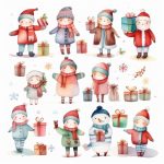 Whimsical children’s storybook style Christmas watercolor characters, smiling reindeer with presents, snowy trees and twinkling stars, soft cheerful tones, whimsical children’s storybook style.