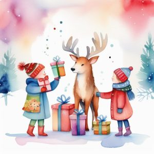 Whimsical children’s storybook style Christmas watercolor characters, smiling reindeer with presents, snowy trees and twinkling stars, soft cheerful tones, whimsical children’s storybook style.