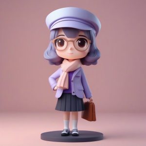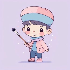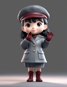 这次想尝试一点法式的优雅感,所以加入了’Beret’(贝雷帽)和’A-line dress’的关键词。酒红色背景非常能衬托出主角的高级感和复古韵味。Prompt中一定要强调’soft studio lighting’,这样才能让Q版角色的皮肤和服装在酒红背景下显得柔和不沉闷。
