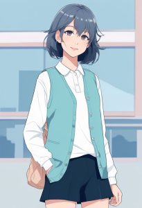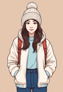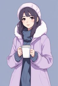 Full body, solo focus, minimalist anime illustration of a Japanese girl in a winter jacket standing in the foreground with sharp lines, but against a slightly blurred solid color background. Features thick bold outlines, flat color filling, low saturation pale blue Macaron palette. Background: clean, simple solid color, completely empty, but with a slight depth of field and soft focus effect.