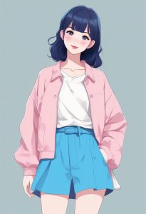 Solo, fashionable girl in a pink and blue outfit, smiling, full body standing shot. Anime minimalist style, using a macaron color palette and low saturation. Strict Cel shading style. Background is a solid color, clean, simple, completely empty, no patterns, no details.