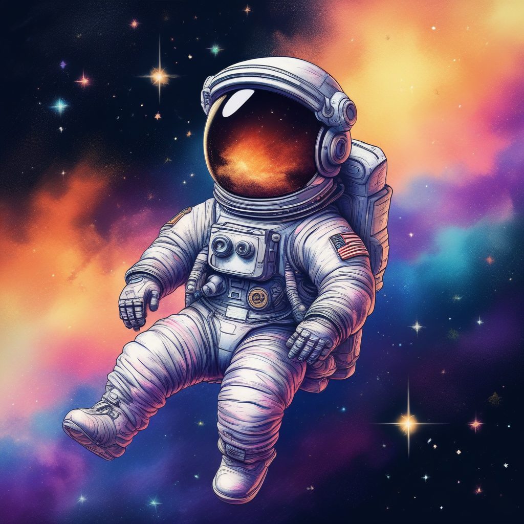 一幅充满(whimsical)想象力的梦幻插画,描绘了一个小小的宇航员人物轻轻漂浮在深邃、繁星点点的太空中。该作品展示了高度纹理化的(crayon style:1.1)和独特的(colored pencil:1.2)技术。它以充满活力的(pastel colors)和温暖的星云色渲染。整体感觉是高度(hand drawn:1.3),具有(soft edges)和丰富的(textured paper)品质,唤起神奇的(storybook style)。构图简洁但细节丰富,光线大气感强。