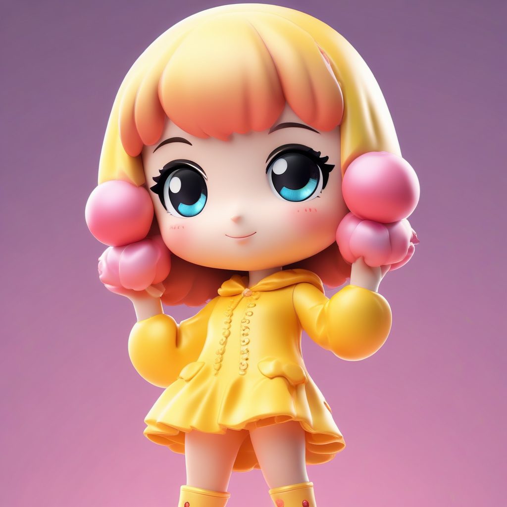 一个独行的极简动漫角色,全身站立照,描绘一个穿着闪亮复古迪斯科服装的卡哇伊Q版女孩,采用广受欢迎的Pop Mart盲盒手办美学风格。角色设计强调迷人的粘土质感和完美圆润的特征,服装上带有亮片光泽。这是一个高保真的3D渲染,通过C4D和Octane渲染引擎实现。她被捕捉在一个动态的抬脚跳舞姿势中,表情可爱且细节丰富。场景使用令人惊叹的光线追踪技术进行精确的全局照明和柔和的工作室照明,展示了充满活力的复古柔和色彩。以高细节的8K分辨率渲染。背景是干净、简单、纯亮黄色的,完全空白,没有图案,所有焦点都集中在手办上。