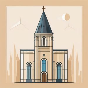 一幅布豪斯风格极简复古建筑海报插画,主体为高耸的钟楼,采用强烈的几何形状、干净利落的边缘和浅米色纯色背景。设计极度简洁,仅用中性色块表现,无窗户及装饰性细节。钟楼独自矗立,造型抽象且大胆。