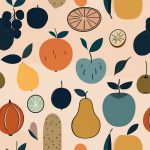 Vintage minimal illustration of stylized fruit, simple shapes, muted retro color palette, decorative patterns, graphic poster feel, subtle shadow for depth.