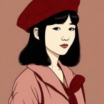 A warm portrait of a Japanese girl holding a vintage film camera. This illustration has a storybook style, featuring soft edges and a comforting warm color palette. It displays a hand drawn aesthetic, rendered using fine colored pencil and a subtle crayon style technique on textured paper. Pastel colors contribute to the nostalgic vibe, set against a solid muted terracotta background.