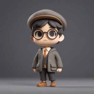 A chibi boy wearing a retro flat cap and carrying a vintage camera. Blind Box Toy style, Chibi, Matte PVC texture, Soft focus, retro color scheme, studio lighting, 3D sculpted aesthetic, rounded and detailed features. Soft yellow geometric background.