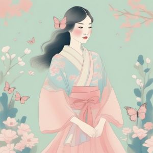 A hand drawn illustration of a soft Japanese girl wearing a straw hat and a long skirt. The artwork relies on minimalist line art, featuring refreshing pastel colors in pink and light blue. It employs a crayon style technique, achieving a whimsical, storybook style. The image exhibits soft edges, warm colors, and a clear textured paper effect. Set against a solid pale blue background.