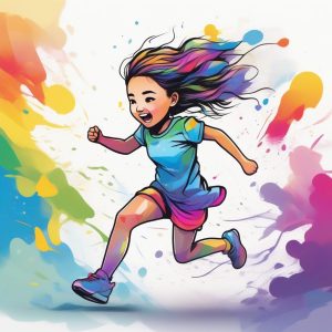 AI绘画提示词中文 – 高对比度:黑色线条、Q版女孩与脚下的彩虹水花