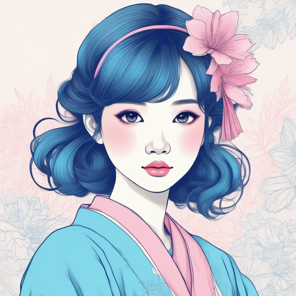A vibrant hand drawn illustration of a soft Japanese girl in pink and blue contrast fashion. The style is whimsical, storybook style, utilizing minimalist line art. The palette features soft warm colors (pastel colors) with soft edges. Coloring employs colored pencil and crayon style techniques, exhibiting detailed paper texture and textured paper feel. Clean, solid color background.