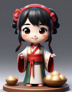 一个可爱的Q版汉服小女孩,圆脸大头,表情自信且典雅。她手持一把精致的折扇。强调盲盒手办美学,具有高度逼真的黏土质感。这是一个专业的3D渲染,通过C4D和Octane渲染器实现,并利用光线追踪在简单的工作室背景下打造出柔和而精确的光影。