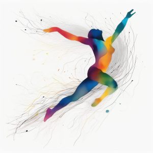 全身描绘一个Q版女孩全速奔跑,动作表情丰富,略微吐舌,顽皮表情。极端的动作姿势和动态的运动感(dynamic sense of movement)。极简线条艺术(Minimalist line art),带有锋利的黑色墨水轮廓线(black ink outlines)。强烈的鲜艳彩虹水彩(vibrant splashes of rainbow watercolors)在她身后形成流线型轨迹并滴落。交错的抽象几何形式(abstract geometric forms)作为框架。纯白色背景。