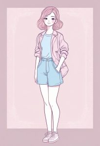 一位面带微笑的时尚女孩的全身像,采用Simple doodle极简风格。她穿着以马卡龙配色为主的服装,色彩是温柔的粉薰衣草和婴儿蓝的柔和调色板。画风特点是柔和圆润的线条和极少的细节。她的表情天真俏皮,散发着轻松愉快的魅力美学。全身站立,IP形象设计。