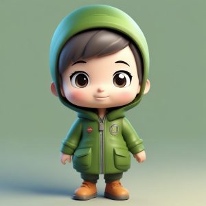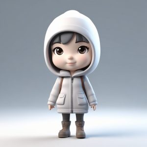A cute chibi character, full body standing, dressed in lightweight winter attire, wearing a thick knit beanie, captured in a dynamic pose of running and turning back, with a surprised and lively expression. Emphasizes the blind box proportion (big head small body) and clay material. This is a high-fidelity 3D render, achieved using C4D and Octane render engines, utilizing ray tracing technology and soft studio lighting. Background is a clean, simple solid color (bright blue), completely empty, using vivid pastel colors, 8K high detail render.