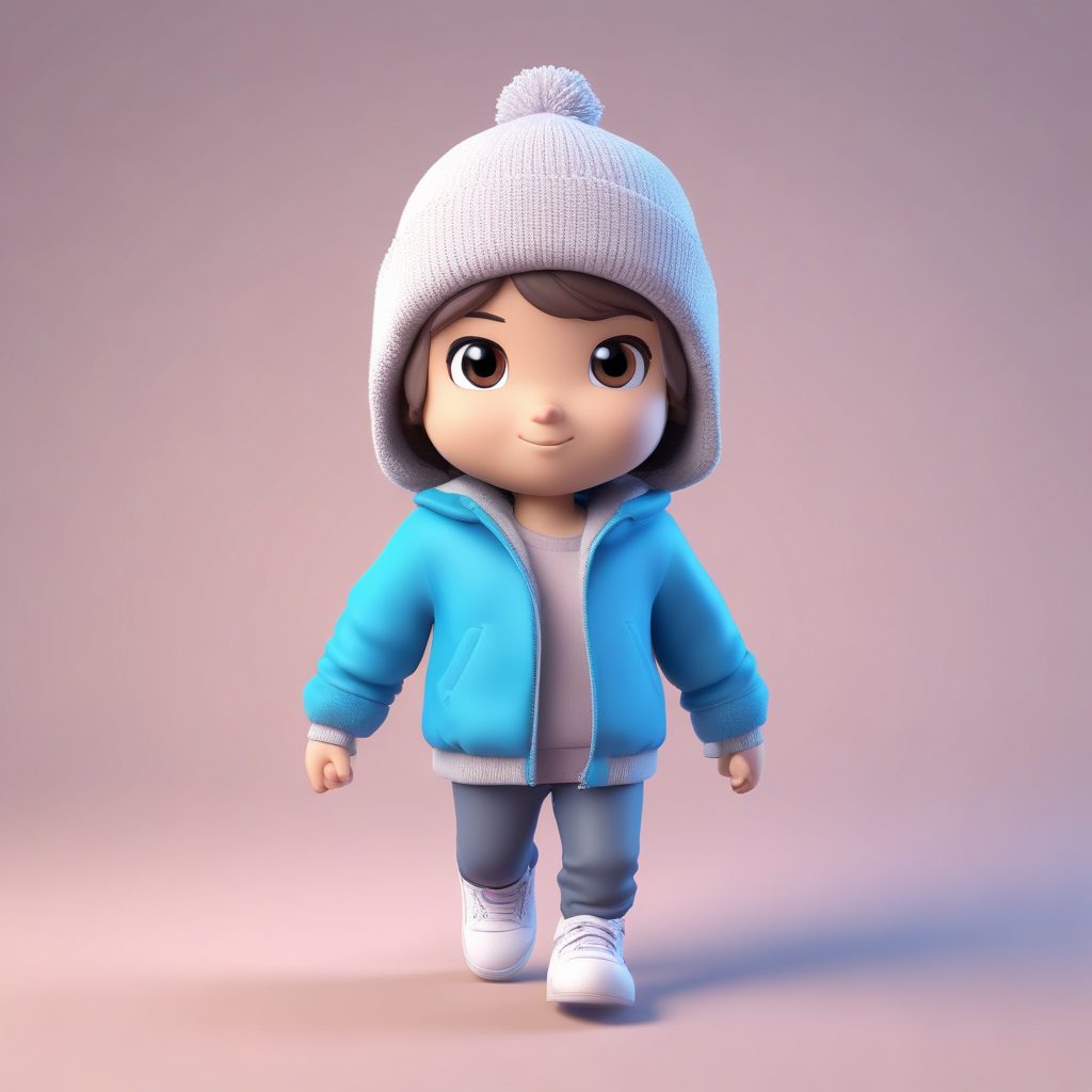 一个可爱的Q版人物,全身站立,穿着轻便的冬装,戴着厚厚的绒线帽,做出跑动中惊喜回头的动作,表情生动。强调大头小身体的盲盒比例和黏土材质。这是一个高保真的3D渲染,通过C4D和Octane渲染器实现,利用光线追踪技术和柔和的工作室照明。背景是干净、简单的纯色(亮蓝色),完全空白,使用鲜明的粉彩色调,8K高细节渲染。